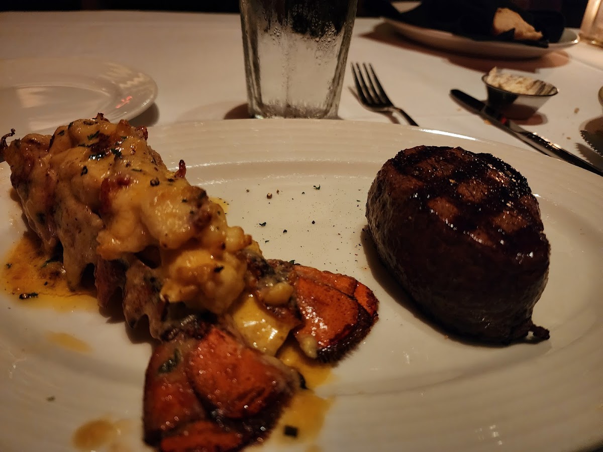Took my parents here for dinner because I wanted to treat them out. The food here was absolutely phenomenal. We ordered the 8oz and 10oz medium-rare filet mignon and the steak was cooked to perfection. The meat was so tender that it basically melts in your mouth. The baked potato was to die for. We also got the lobster risotto, which was one of the creamiest risotto I ever had. Great infusion of lobster flavor as well. They also did not cop out on the amount of lobster in the risotto. We finished the dinner off with pecan pie along with cinnamon and vanilla ice cream. My mom also ordered the seafood salad and let's just say they were also very generous with the portion of seafood in her salad. Overall, each dish was pricy (but reasonable for a mid upper scale steakhouse), but the portion sizes were excellent. I highly recommend this place if you are looking for a upper scale dinner relative to what you normally eat. Parking was super easy. The restaurant is located in a parking lot with plenty of parking spaces.